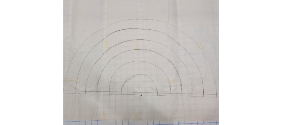 You will draw four more arcs, one at 8”, one at 6”, one a 4” and the final one at 2” using this same method.