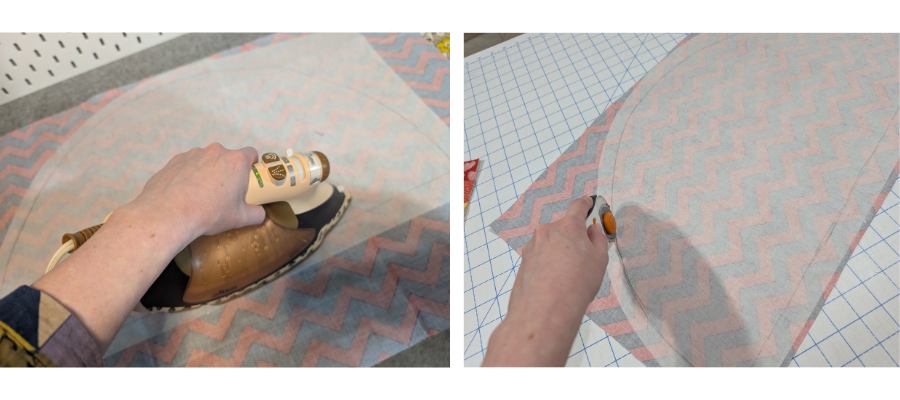 Pin the red fabric along the top curve leaving ¼” overhang at each end.