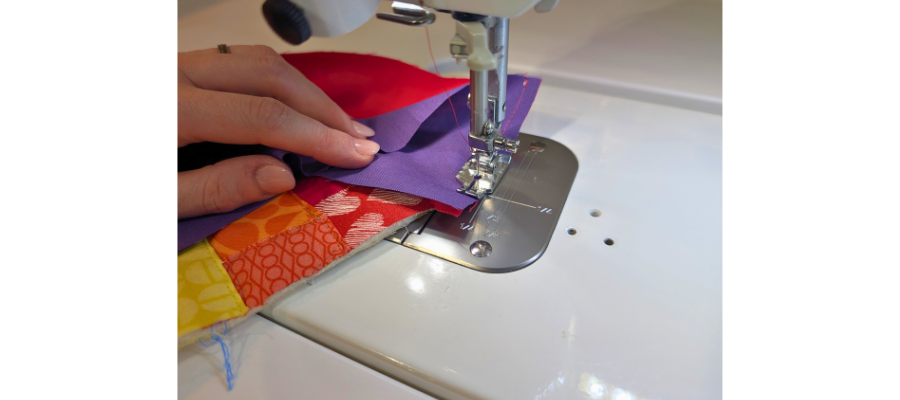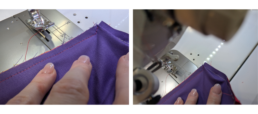Sew the backing piece to the other side of the strips starting just past the middle of the bottom edge. The corners should align with the purple strip end including the seam allowance to make sure it is positioned properly. When you get to ¼|” of the corner, put the needle down and manipulate the fabric before making the turn.