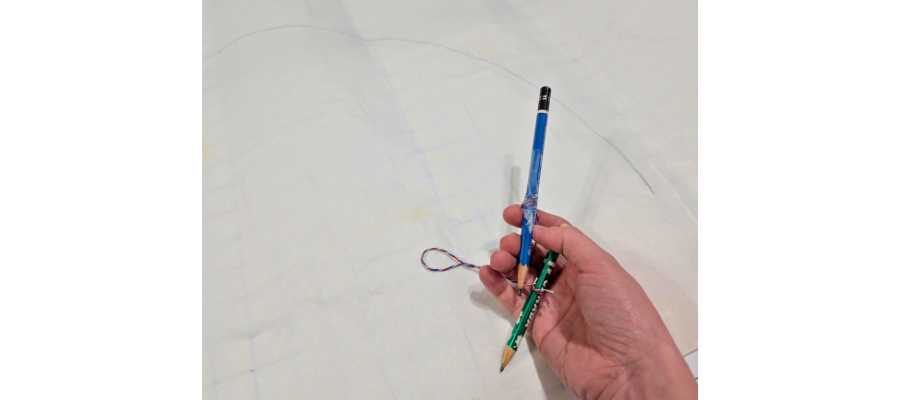 Tie two pencils together with string. You may need to adjust your knot or wrap around one pencil and tie until the points of the pencils measure 12” apart. You can also use a pair of compasses if you have ones big enough to make a 12” radius.