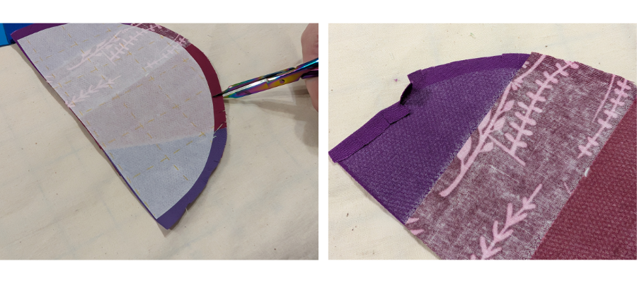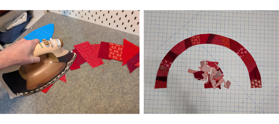 Cut a 3 ½” strip of each of the red and purple fabric from selvedge to selvedge. The red strip should measure the length of the top arc plus ½” and the purple should measure the length of the bottom edge plus ½”. Measure your piece to check your finished size.