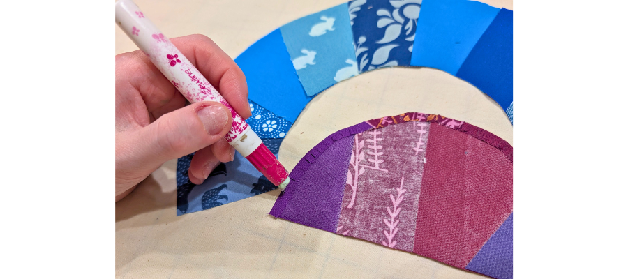 To attach the pieces together, add glue to the folded edge and apply the piece to the seam allowance on the inside of the next arc.