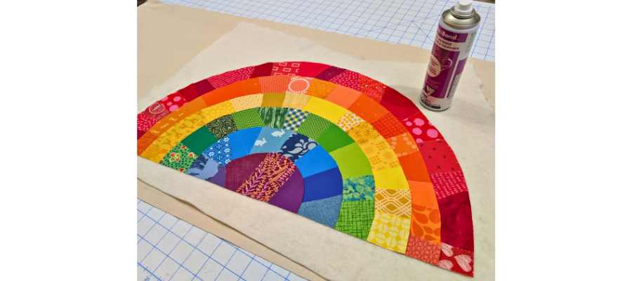 Next, baste the rainbow to a piece of scrap batting and a piece of canvas for rigidity. This can be done with spray baste or with pins.